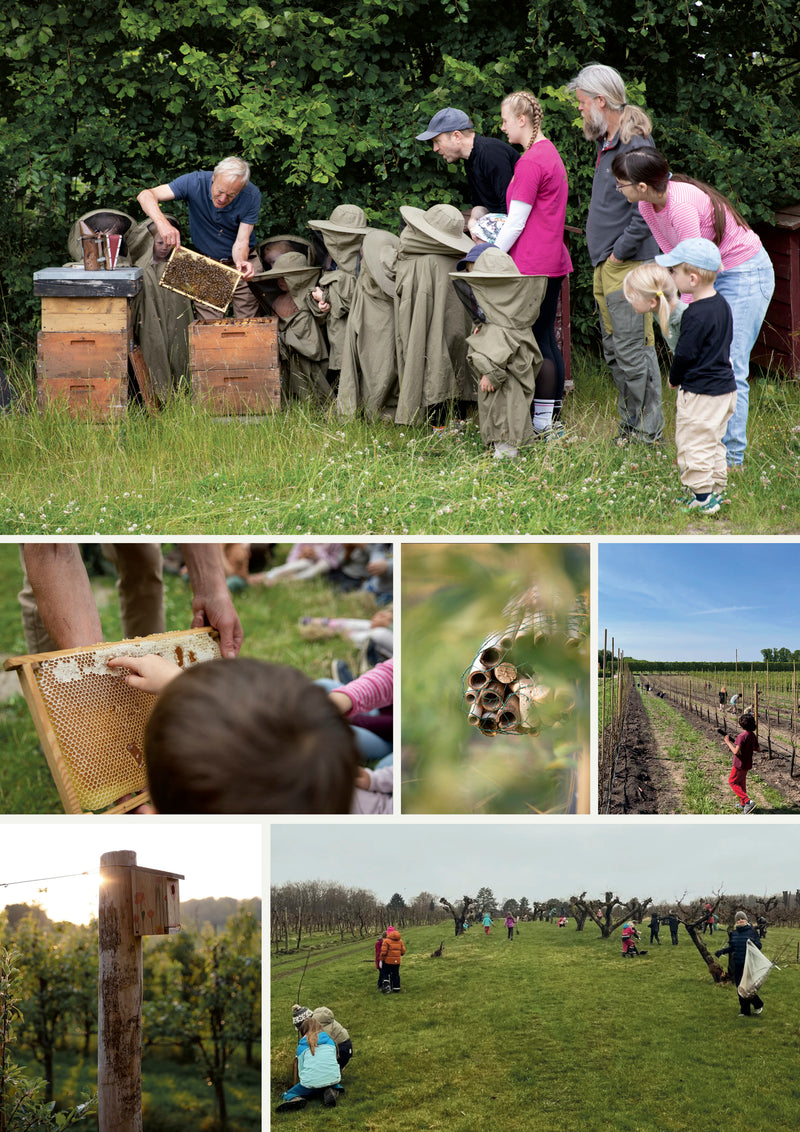 Vi åbner gerne vores plantage op for lokale skoler og institutioner, der kan bruge plantagen som et læringsrum. Her får børnene mulighed for at komme helt tæt på naturen, lære om biodiversitet, og forstå, at et stykke frugt ikke bare er noget, der kommer fra en maskine. Det tager tid at dyrke mad, og det kræver omtanke. Sammen med lærere og elever bygger vi fuglehuse, sår blomsterfrø, hænger barkbeskyttere op og laver insekthoteller. Vi taler om livets gang på plantagen, om biernes vigtige arbejde og om hvorfor en lille brun plet på et æble ikke betyder, at det fejler noget.